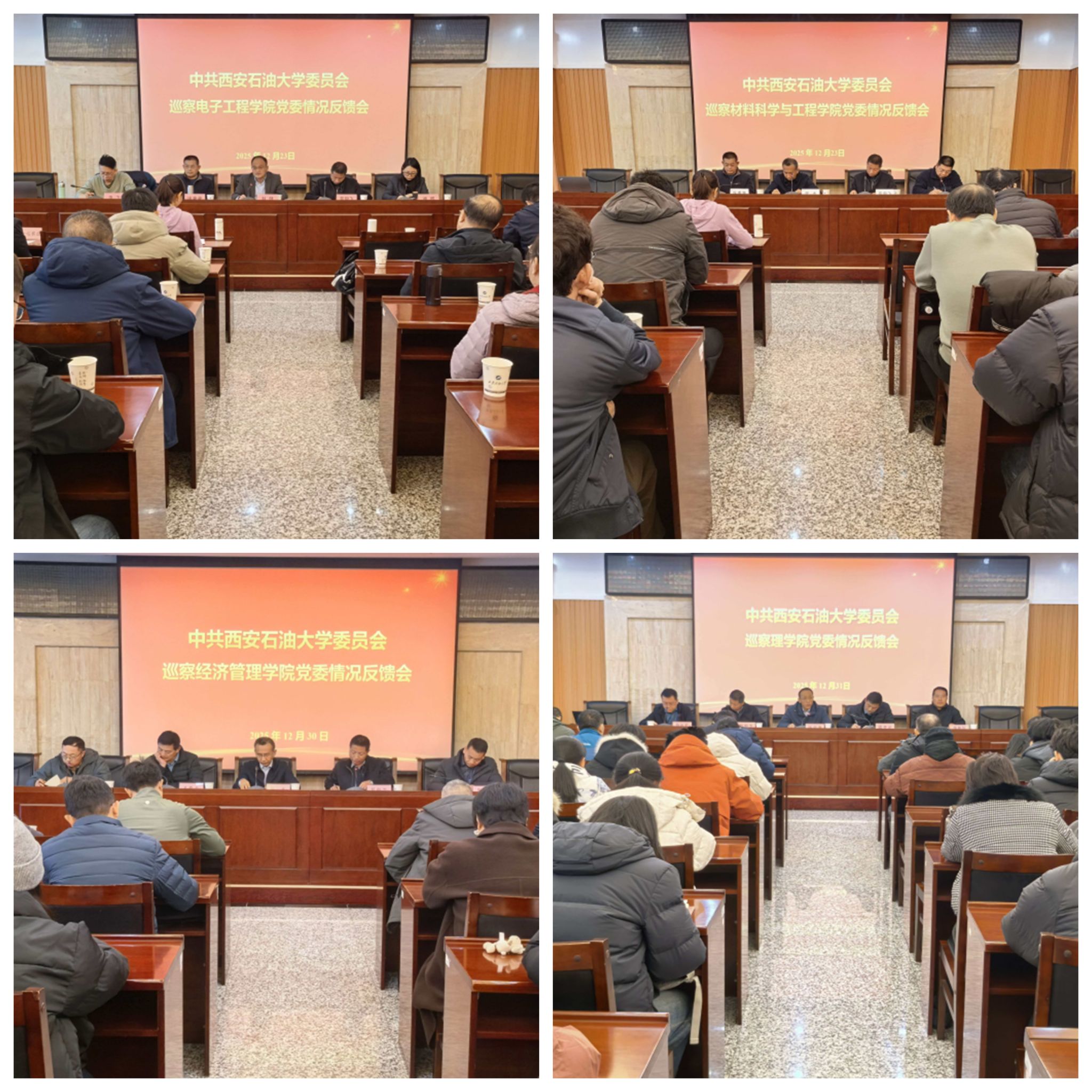 反馈指出,被巡察的四个学院党委坚持以习近平新时代中国特色社会主义思想为指导,认真学习宣传贯彻党的二十大精神及二十届二中、三中、四中全会精神和习近平总书记历次来陕考察重要讲话重要指示精神,深入贯彻落实党中央重大决策部署及省委具体要求,切实加强党的政治建设,管党治党责任不断压实,全面从严治党明显加强,基层党的建设更加扎实,政治生态总体向上向好。同时,反馈严肃指出了被巡察党组织在“四个聚焦”和党组织主要负责人履行全面从严治党第一责任人责任等方面存在的具体问题,要求被巡察学院党委要以彻底的自我革命精神抓好整改,做到件件有着落、事事有回音。