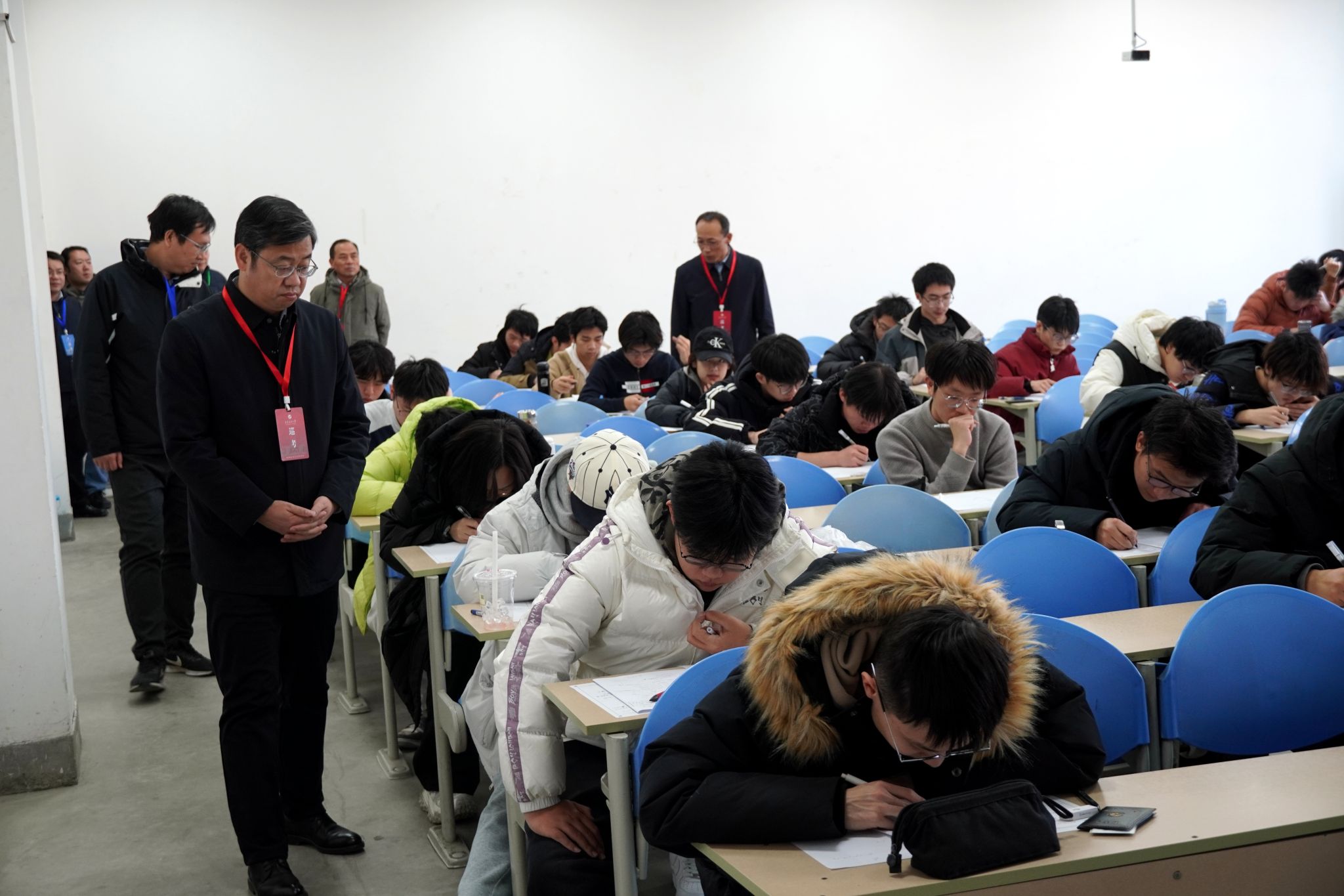 考试期间,校长王进富,校党委副书记张木、程永清,副校长张荣军、张君涛等校领导率队开展巡视工作。在党委办公室(校长办公室)、组织部、宣传部、学生工作部、教务处、科研处等部门负责人的陪同下,首先来到博览楼可视化中心,通过实时视频监控系统察看了各考场的整体情况,随后深入教学楼多个考场进行现场巡查。巡视过程中,校领导仔细询问了考场布置、监考安排、考试秩序以及学生的应考状态,对考试组织工作的严谨性、考场纪律的良好表现以及全体考务人员的辛勤付出给予充分肯定。