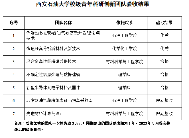 根据《beat365官方网站科研创新团队建设与管理办法》与《beat365官方网站青年科研创新团队建设与管理办法》(西石大科〔2021〕23号)文件精神及学校关于团队考核的通知要求,经团队自评申报、院系审核、科技处审查、学校组织专家评审等环节,现将各类团队期满验收和中期检查结果公示如下。
