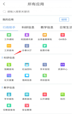 已安装“i西石大” APP的师生,登录成功后,通过点击“首页”->“全部应用”->“行政助手”中的“办事大厅”进入网上服务大厅,选择相关业务进行办理。