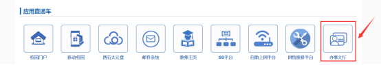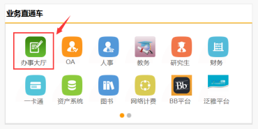 (2) 学校首页下方快速通道的“服务门户”登录后,选择服务门户“首页”->“业务直通车”中的“办事大厅”进入网上服务大厅;