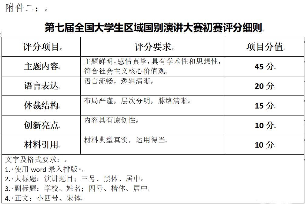 2025年8月20日18:00前,选手加入校选赛群后填写参赛报名表,填写完成后,将报名表、命题演讲电子版演讲稿、演讲视频、学生证扫描件一并打包,以压缩包的形式发送至邮箱306639848@qq.com,提交后不可修改。邮件主题及压缩包以“学校-学院-姓名”命名,压缩包内具体文件以“学校-学院-姓名-报名表/演讲稿/学生证”命名。