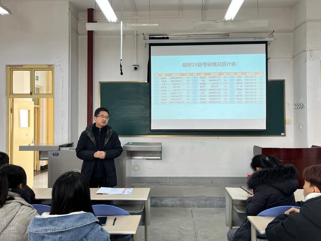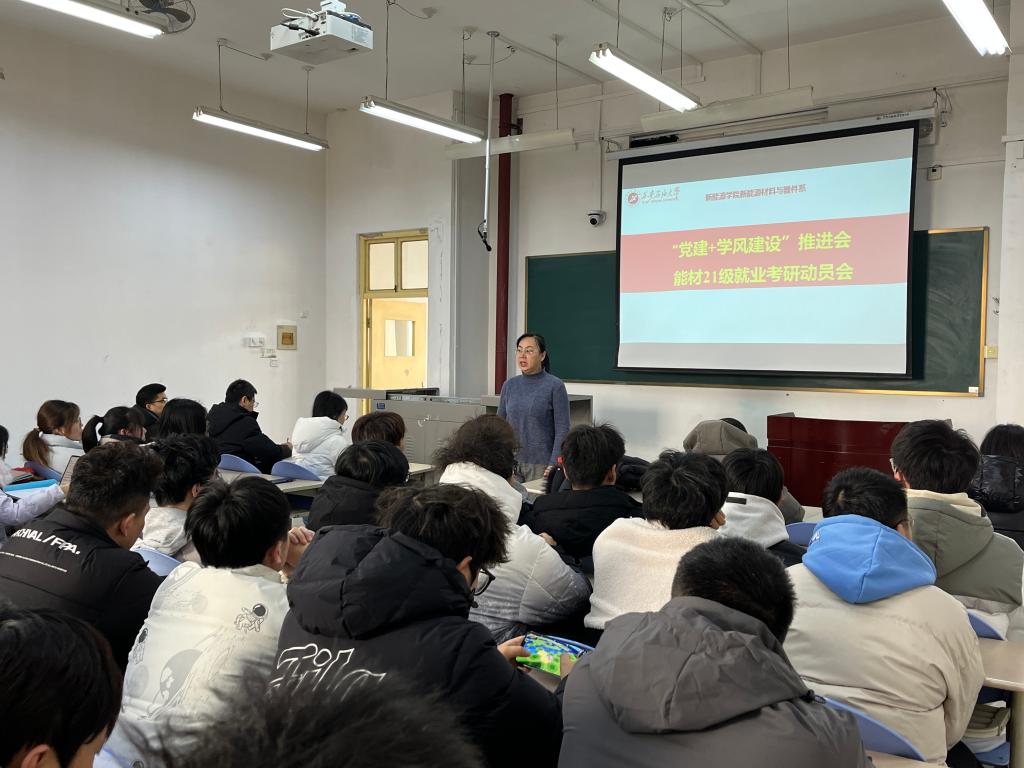 为进一步加强学院学风建设,构建“党建+学风”协同育人模式,助推学院考研就业工作,12月19日上午,新能源学院“党建+学风建设”推进会暨2021级考研就业动员大会在鄠邑校区博览楼427室举行。新能源材料与器件系主任肖美霞、副主任王磊,新能源材料与器件系教工党支部书记安敏荣,青年教师何萌,能材2101-2102班班主任王党会、李钊,辅导员马武军及能材专业2021级全体学生参会,会议由肖美霞主持。