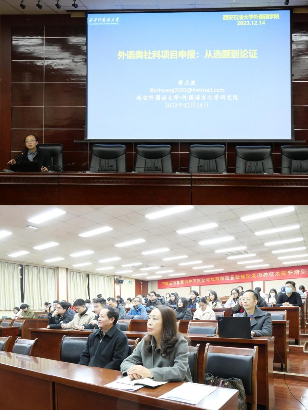 为提升学院师生社科类科研项目申报水平与质量,12月14日下午,外国语学院邀请西安外国语大学二级教授、博士生导师黄立波教授开展了题为“外语类社科项目申报:从选题到论证”学术讲座。外国语学院师生共100余人聆听了本次讲座。讲座由副院长刘辉主持。