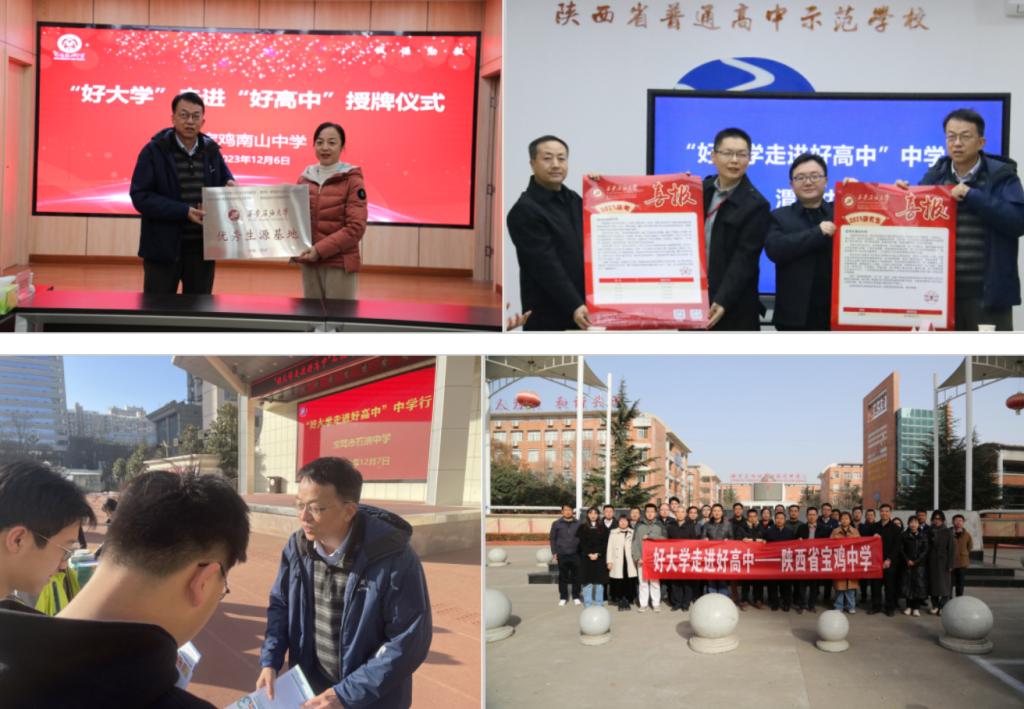 12月7日上午,在宝鸡市石油中学,王成和张伟两位副校长对大学老师的到来表示热烈欢迎,在讨论了高招工作中高中和大学合作意向以及授牌和优秀毕业生考研喜报后,工作组在该校体育场对高三学生开展招生宣传工作,并发放招生宣传资料。在宝鸡金台中学,首先校内对高三学生进行招生宣传,答疑解惑,发放招生宣传资料,再和各高校一起与校方座谈,呈送今年录取的优秀学生和学生考研的喜报,高效完成宝鸡市的招生宣传走访、喜报呈送及优秀生源基地挂牌工作。这次宝鸡之行新增优秀生源基地1个,在5所学校进行了招生宣传,招生宣传工作取得圆满成功。