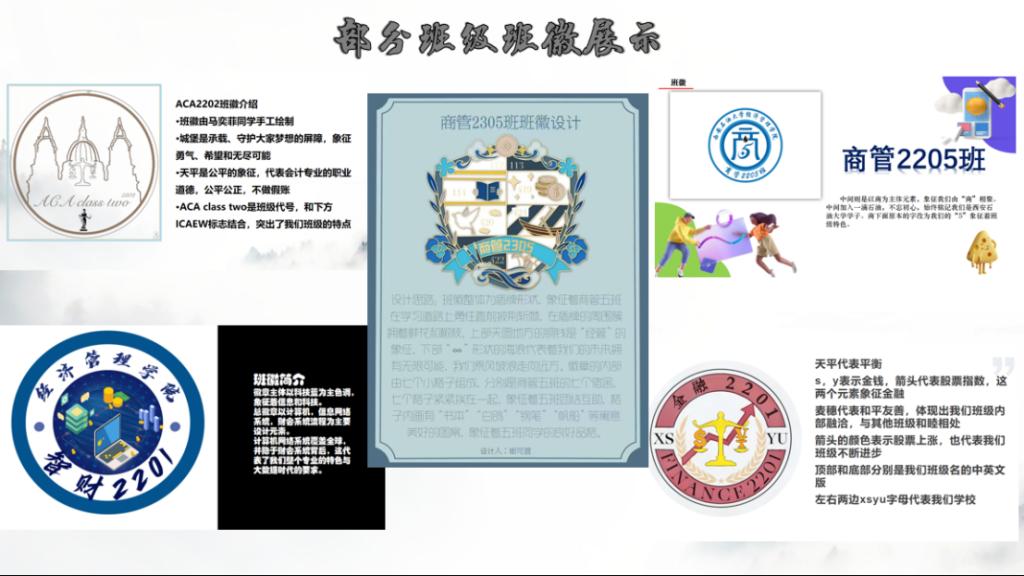 本次大赛参赛对象为学院2022级、2023级各班级,自11月初开始作品征集,鼓励班级全体成员参与设计,群策群力,发挥自身特长。经过首轮评审,共有11个班级进入决赛。在决赛中,各班以视频、PPT、舞蹈、朗诵等形式全方位展示班级风采。商管2305班以初心如磐,行稳致远,坚定信仰,奋楫笃行作为他们的行为规范,“在青春路上尽情展现自我”是他们的班级特色,班歌《我的未来式》体现了商管2305班同学对未来的期望与憧憬,以及敢于追梦,争取圆梦的斗志与激情。智财2201将“智勇双全,爱拼财会赢”作为本班的班训,班徽设计主体以科技蓝为主色调,象征着信息和科技,融合信息网络系统,财会系统流程等设计元素。国贸2202班以“严于律己,宽以待人”为关键词,勉励每一位同学变得更好,更加优秀。“既要仰望星空,又要脚踏实地”是他们的宣言。经过激烈的角逐,商管2305班荣获一等奖,智财2201班和国贸2202班荣获二等奖,商务2301班、ACA2302班、商管2304班荣获三等奖,商管2205班、金融2201班、ACA2202班、ACA2301班、商管2308班荣获优秀奖。