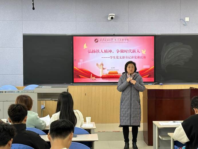 为深入开展学习贯彻习近平新时代中国特色社会主义思想主题教育,激发广大党员责任意识,担当意识,激励全体党员继承和弘扬铁人精神,进一步发扬红色传统,赓续红色血脉。电子工程学院于2023年11月13日在博览楼209举办“弘扬铁人精神,争做时代新人”学生党支部书记讲党课活动,院党委副书记毕轶慧,学生工作办公室主任钱宇航,院兼职组织员李君及各支部支委等四十余名师生参加,会议由2022级辅导员沈轩羽主持。