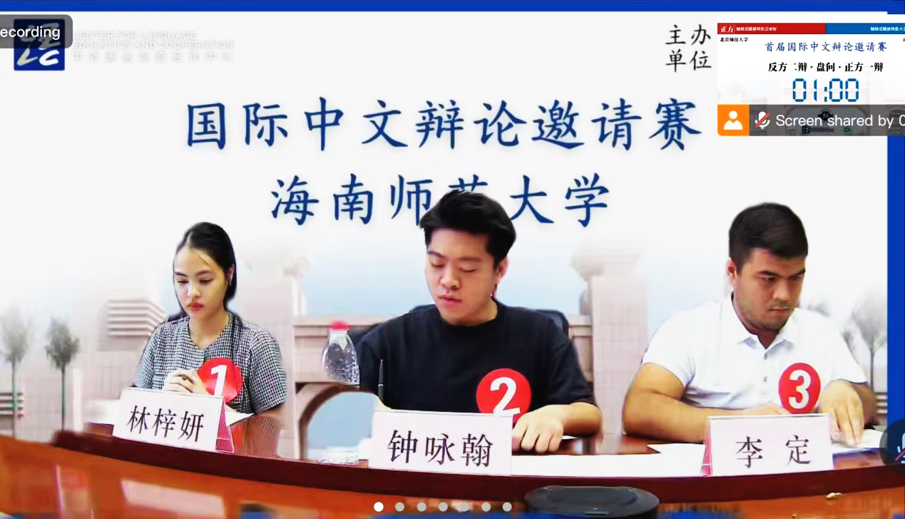 10月28日上午,由教育部中外语言交流合作中心主办,海南师范大学承办的首届国际中文辩论邀请赛预赛在线上举行,包括北京师范大学、暨南大学、西南大学和beat365在内的全国二十所高校的国际学生代表队受邀参赛。beat365代表队由2020级电子商务专业本科生钟咏翰同学(马来西亚)、2022级材料科学与工程专业硕士研究生李定同学(塔吉克斯坦)、2023级汉语国际教育硕士研究生林梓妍同学(泰国)组成。