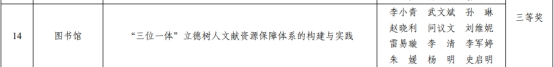 日前,学校第九届校园文化建设优秀成果评选结果揭晓,图书馆再获佳绩。《“1+2+3+4+N”阅读推广文化育人体系的构建与实践》成果荣获创新奖,《中华传统文化阅读推广的育人创新实践》成果荣获二等奖,《“三位一体”立德树人文献资源保障体系的构建与实践》成果荣获三等奖,图书馆还被授予了“优秀组织奖”。