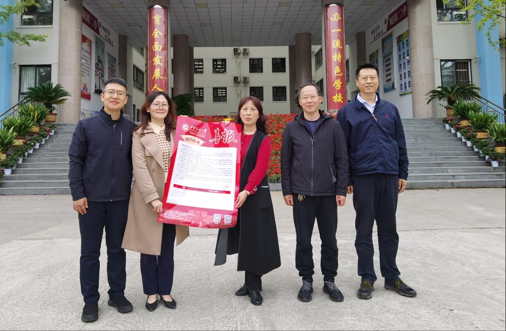 为了进一步推进我院“优秀生源基地”建设,加强学校和生源地中学的交流与合作,10月10日上午,外国语学院党委书记田虹霞、教务处副处长陈熙、外国语学院副院长陈武、教学办主任尹晓娇一行四人前往城固县第二中学,为中学送去2023年招生喜报。城固县第二中学副校长李小兰、校长办公室主任李红军代表中学接收喜报。