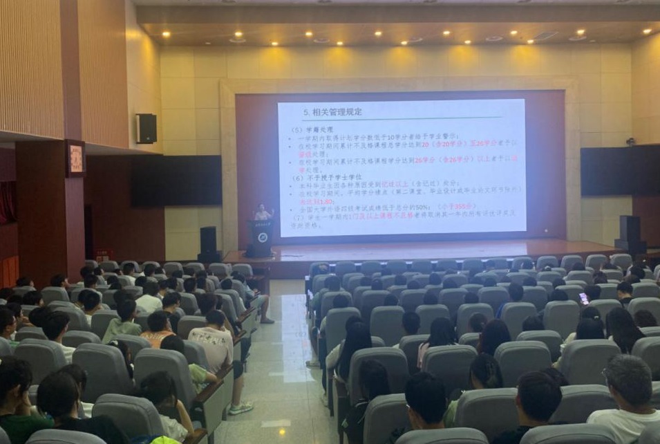 为促进2023级新生更快适应大学生活、制定合理目标,进一步加强学生日常教育管理,学院召开2023级新生年级大会,学生工作办公室主任郭媛从“大学是什么”“大学的特点和意义”“大学规划”“大学日常行为规范”四个方面向新生介绍了到大学之后应及时转变身份和习惯,尽快适应大学生活,提前做好大学规划,度过充实圆满的大学生活。最后,郭老师带领全体新生学习了《学生手册》,针对学籍管理规定、公寓管理办法、奖助学金评定、学生在校期间的权利和义务、违纪处分办法等有关学生切身利益的部分做了详细解读。