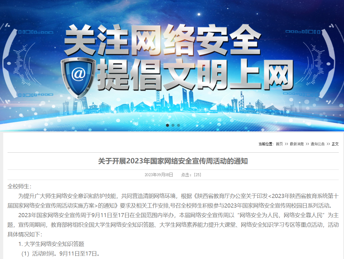 学校安排印发了《关于开展2023年国家网络安全宣传周活动的通知》,组织全校师生积极参与2023年国家网络安全宣传周系列活动。