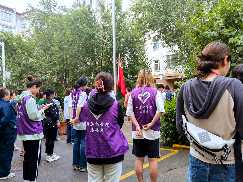 7月10日,社区组织升旗仪式,群众自发的到达现场,狭小的广场中挤满了社区的男女老少。实践团全体成员也参与其中,统一的紫色队服和整洁的精神面貌为社区每周一的升旗活动增添了一道不一样的风景。
