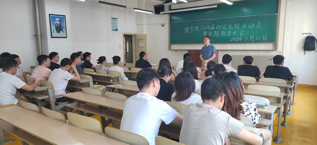 6月21日下午,理学院在雁塔校区东方石油楼1004教室举办了2024届研究生就业动员暨专题教育大会。副院长折延宏主持,党委副书记马小刚主讲,研究生辅导员庞波和2024届40余名研究生同学参加。