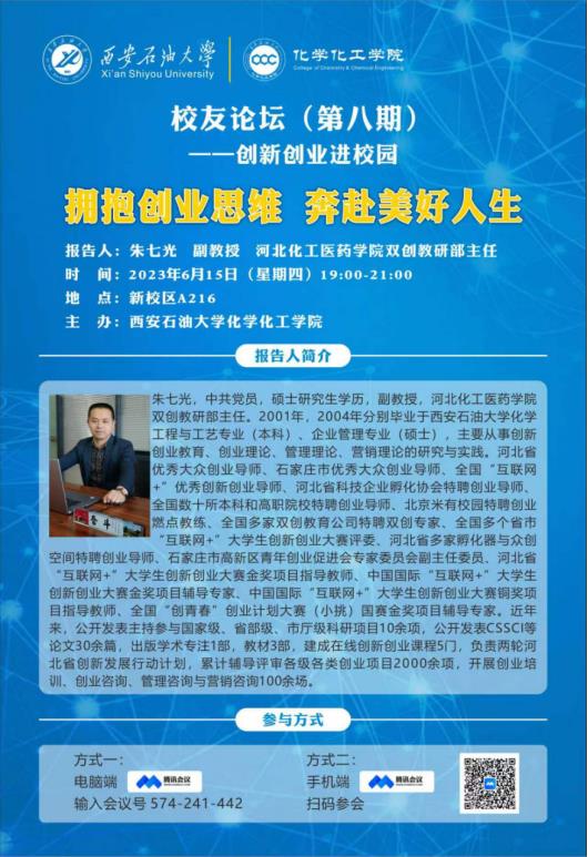 为培养大学生创新创业思维,进一步促进高质量就业创业,6月15日,化学化工学院邀请2001届校友朱七光副教授,开展“拥抱创业思维,奔赴美好生活”专题讲座,吸引全院百余名学生到场聆听。