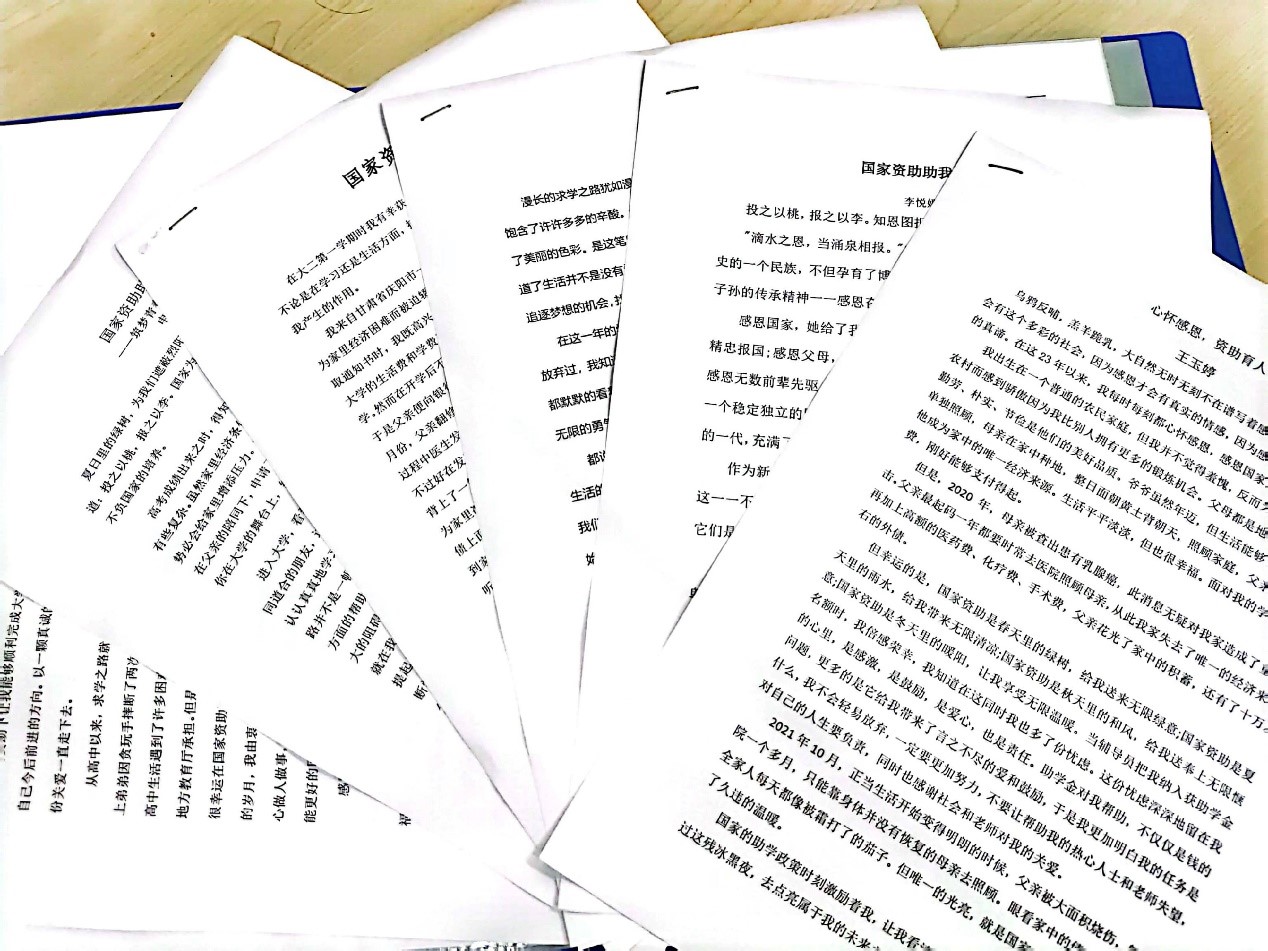5月下旬,我院结合历年资助工作进度,以“国家资助助我出彩”为主题,在学院内开展主题征文比赛,动员我院全体在校受助学生参与。征文能够从学生的思维和角度充分反映国家资助对学生本人及其家庭产生的影响,情感丰富,感染力强,富有教育引导意义。学院经过集中评选,推出优秀征文6篇,通过新媒体平台加强在学生群体中的宣传,充分发挥引领作用。