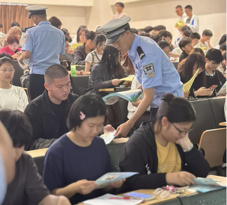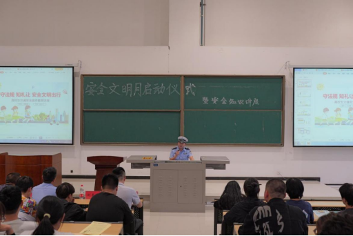启动仪式结束后,刘养峰以《遵规守法 平安出行》为主题,进行了交通安全知识讲座。他基于《道路交通安全法》的相关知识,围绕“驾驶摩托车和电动车注意事项”“一盔一带”“酒驾问题”等开展讲座,并结合本人多年交管宣传经验,以详尽的数据、生动的事实和惨痛的教训分析了交通事故严重的后果和危害,进一步讲授常见交通安全突发情况自我防护、应急处理技巧和措施。他希望全体学生干部能够共同携起手来,营造人人遵守交通法规,人人宣传交通法规,人人具有自我防范意识的交通安全氛围,让广大学生远离交通事故,构建美丽和谐校园。