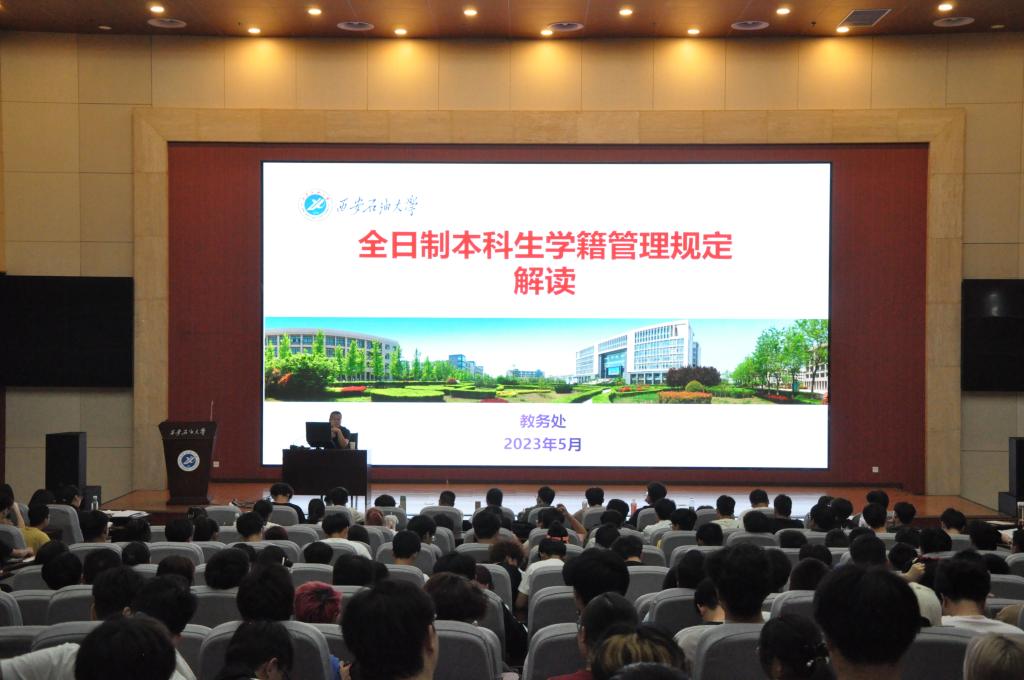 为进一步使在校生详细了解学校关于学籍管理的相关规定,保障学生的合法权益,从校规校纪严格要求学生,加强学生间的学风建设,石油工程学院于5月24日下午、晚上在beat365官方网站鄠邑校区学术报告厅进行两场全日制本科生学籍管理规定解读讲座,主讲人为教务处副处长马加传、教务处教务科科长张浩,2021级辅导员秦馨雨、2022级辅导员聂康晨主持本次讲座,2021级、2022级全体学生参加本次讲座。