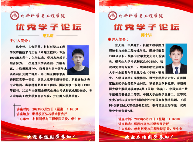 5月22日下午,材料科学与工程学院在鄠邑校区弘石报告厅举办优秀学子论坛第九讲和第十讲,本期邀请到的优秀学子是机械工程学院张天雨,目前被北京林业大学录取攻读研究生;材料科学与工程学院陈中元,目前被哈尔滨工程大学烟台研究院录取攻读研究生。我院300余名本科生参加论坛。