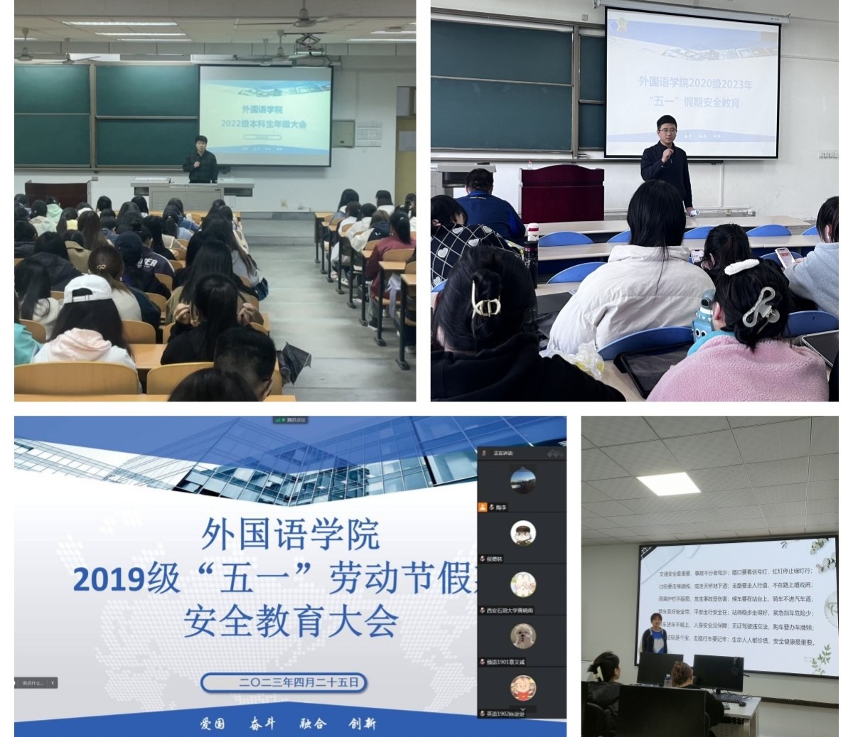根据学校和学院安排部署,4月25日至27日,外国语学院在鄠邑校区B105、B114、A134以及线上形式分别召开“五一”假期安全教育年级大会。