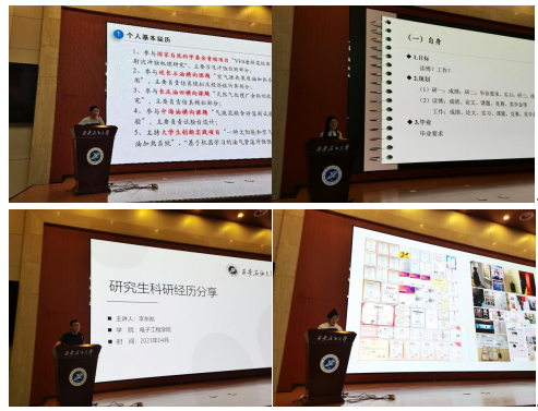本次交流会邀请2022年研究生国家奖学金获奖代表经济管理学院许晶晶、机械工程学院陈浩宇、电子工程学院李东航、人文学院方楠楠4位同学进行分享交流。
