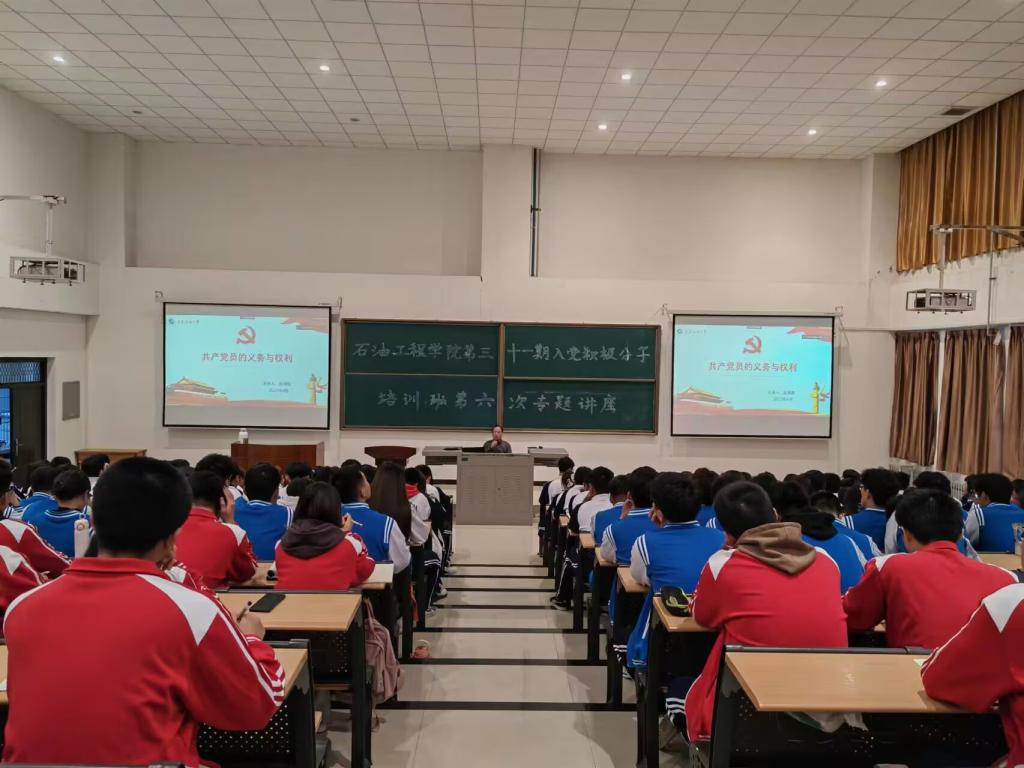 为规范党员发展流程,加强对入党积极分子的教育培训,进一步提高党性修养和理想信念,石油工程学院于4月13日晚在开物楼115教室成功举办第三十一期入党积极分子培训班第六讲。本次授课线上线下同步进行,beat365党委宣传部常务副部长赵承胜受邀担任主讲,授课主题为“党员的义务和权利”。