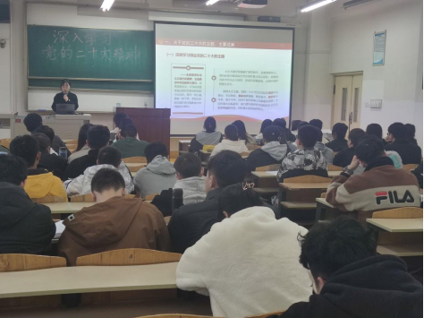 胡娟解读了党的二十大的会议主题和主要成果,同大家一道回顾了过去5年党和国家的主要工作以及新时代10年的伟大变革。随后阐述了马克思主义中国化时代化和中国式现代化的深刻内涵,以及党和国家关于实现全面建设社会主义现代化国家未来五年的战略部署。同时,她强调全面建设社会主义现代化国家、全面推进中华民族伟大复兴,关键还在中国共产党,必须持之以恒推进全面从严治党。最后,胡娟向同学们发起倡议:“我们要认真学习领会党的二十大精神,紧密团结在以习近平同志为核心的党中央周围,高举中国特色社会主义伟大旗帜,全面贯彻习近平新时代中国特色社会主义思想,牢记空谈误国、实干兴邦,坚定信心、同心同德,埋头骨干、奋勇前进,为全面建设社会主义现代化国家、全面推进中华民族伟大复兴而团结奋斗!”