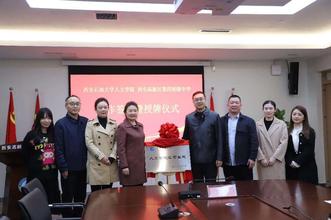 近日,人文学院与西安高新区第四初级中学举行了实习基地挂牌仪式。人文学院院长李涛、党委副书记盛丹、设计系主任曹盼宫和设计系教授肖雪锋等师生与西安高新区第四初级中学党支部书记执行校长万江、教师代表刘凯、卢钰芊、李雅雯等出席了签约仪式。