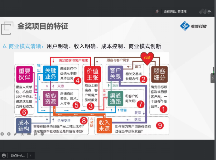 课程最后,蔡老师通过对几个经典案例的讲解与分析强调了大赛项目中所需注意的其他事项,如“把握好市场容量”“收集并利用好相关资源”“构建好核心成员”“拥有过硬的科研成功”等。并表示希望学员们能深刻领会此次课程内容,积极参赛,争创佳绩。
