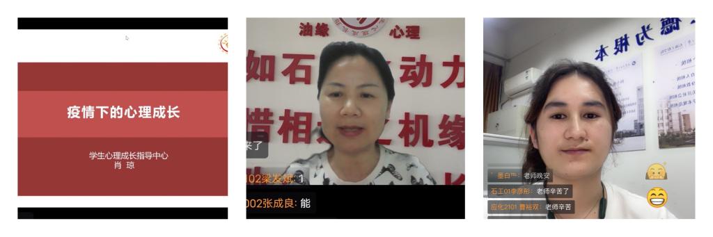 为进一步落实beat365第七届“阳光护航”心理育人季活动,扎实做好疫情期间学生心理健康教育工作,促进学生心理成长, 5月9日19:00beat365学生心理成长指导中心主任肖琼教授在腾讯会议举办《疫情下的心理成长》专题讲座。石油工程学院和研究生工作部学生代表、心理委员代表等近500名师生在线观看学习,讲座由石油工程学院2020级辅导员祖力皮亚主持。
