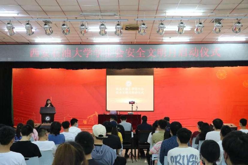 4月27日晚,由校学生会主办的2022年“安全文明月”系列活动启动仪式在鄠邑校区腾辉大学生活动中心举行,西安市公安局鄠邑区分局反诈中心民警刘海、保卫处副处长袁坤、校团委副书记孙浩哲、校学生会及各院系学生会学生代表共计45人在现场参加了启动仪式,全校150余名班级安全委员通过网络直播参加仪式。本次启动仪式由校学生会执行主席郭丽玮主持。