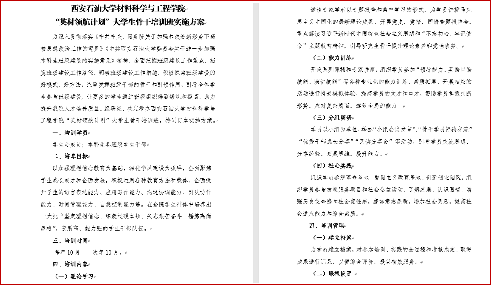 班级建设·工作创新 【“英材领航计划”大学生骨干培训班】从2021级本科生开始,学院坚持以加强理想信念教育为基础,深化班风学风建设,全面聚焦学生成长成才和全面发展,积极运用各种教育方法和载体,全面提升学生的语言表达能力、应用写作能力、沟通协调能力、团队协作能力、时间管理能力、自我控制能力。旨在从低年级开始培养出一大批“坚定理想信念、练就过硬本领、矢志艰苦奋斗、锤炼高尚品格”,素质高、能力强的学生干部队伍。