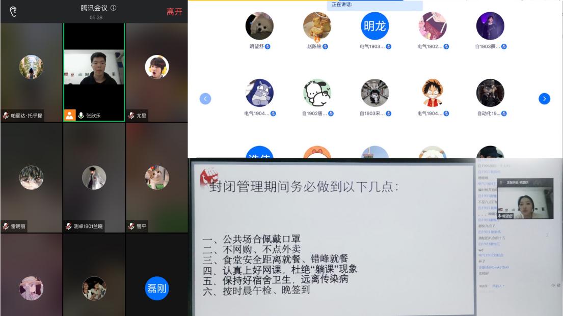 当晚,根据工作安排,电子工程学院各班召开线上疫情防控主题班团会。在各班的主题班团会上,辅导员就学校近日关于疫情防控的各项要求向学生们提出了封闭管理期间六准则:一是在校园公共场所严格佩戴好口罩;二是食堂就餐“错峰就餐、间隔就座”,购餐时要保持一米间隔;三是暂停线上购物与外卖,严禁通过围墙投递物品;四是认真上好网课,杜绝 “躺课”现象;五是保持宿舍卫生,远离各类传染病;六是做好晨午检、晚签到打卡,力争打卡率达到100%。