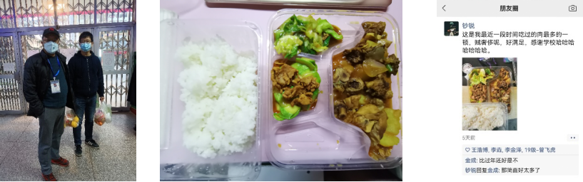 ——送餐上门,鼓舞抗疫信心。学院为被隔离的130名研究生购买盒饭,为他们送上可口暖心的饭菜,鼓舞学生们坚定信心,克服困难,同心抗疫。