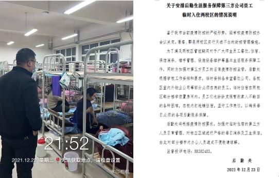 为了扎实做好校园封控情况下各项后勤服务保障工作,后勤处采取紧急动员措施,确保两校区为广大师生员工提供餐饮、住宿、保洁消杀、楼宇管护、设施设备维修值守等基本生活服务保障的人员始终在校在岗。为此,安排和动员了外聘人员、第三方餐饮公司和物业公司等必须服务保障岗位上的600多名员工临时住宿在两校区部分楼宇空置房间内。令人感动的是,这些员工也无怨无悔,积极响应,暂舍小家为大家,白天在校园各处服务保障岗位上服务师生,晚上在简陋的临时休息处睡架子床,甚至铺床板、打地铺。同时,后勤处一方面根据疫情防控要求,特别加强对临时住宿人员的秩序管理,严格进行每天的消杀及卫生保洁。另一方面,也要求各中心对所有服务保障人员给予一定的关心和关爱,让大家住的安心、干得认真。