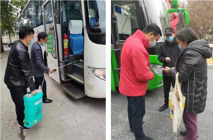 图:通勤班车人员进行车辆消杀和执行乘车人员测温和核查措施