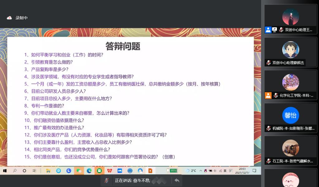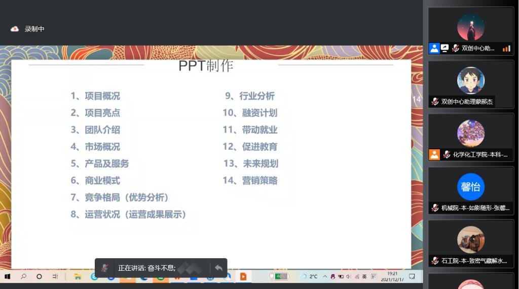 12月17日晚,由创新创业中心主办的beat365官方网站2021年大学生创新创业训练营第八讲顺利开课。本次课程以《路演技巧和流程》为主题,训练营全体学员参加了本期课程。