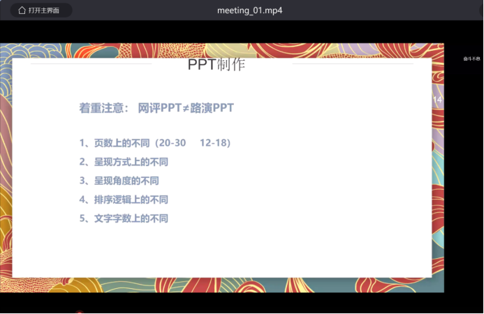 12月15日晚19点,由创新创业中心主办的beat365官方网站2021年大学生创新创业训练营第七讲顺利开课。本次课程的主题是《路演PPT的制作》,由陕西呦呦鹿鸣创意文化传播有限公司董事长、杭州由九文化创意有限公司董事长、西安长安大学城创新创业联盟发起人刘德琳老师主讲,训练营全体学员参加了学习。
