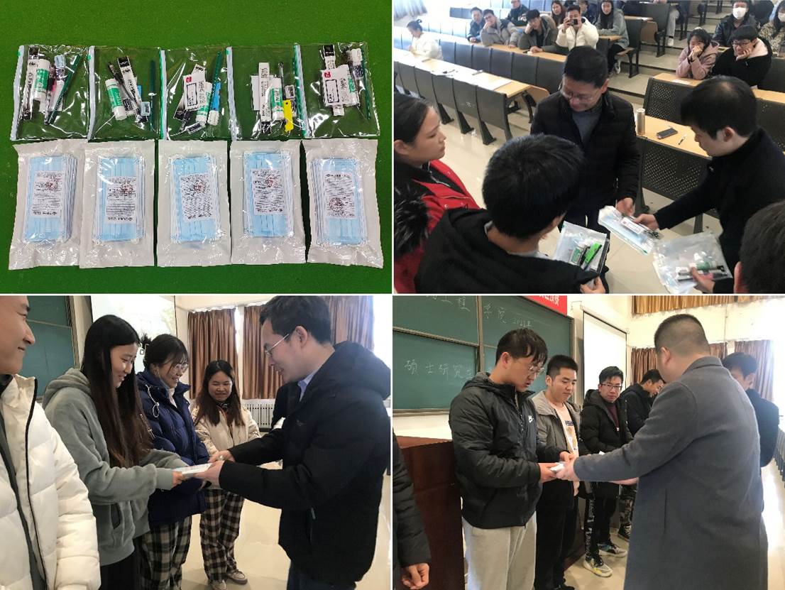马勇书记、张建高副书记和朱战威主任还为学生代表发放了爱心加油包并合影留念。老师们将承载着学院爱心与期盼的加油包亲自递到学生的手上,同时送出祝福,增强了考研学子的信心,礼包虽小,爱心无价。