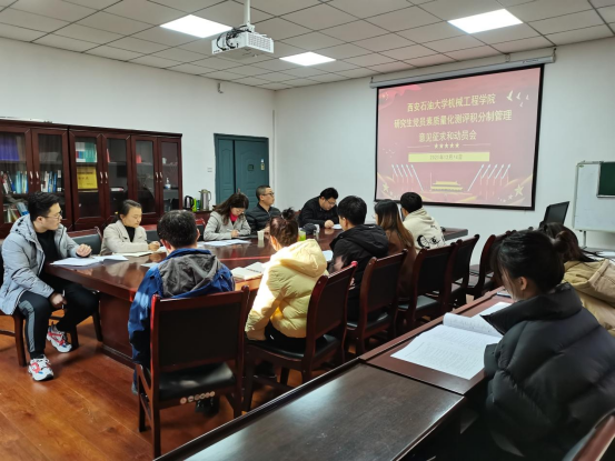 12月14日下午,机械工程学院于雁塔校区第4实验楼425会议室召开了研究生党员素质量化测评积分制专题动员会。研工部副部长李甦、院党委副书记刘冰、副院长崔璐、研究生辅导员欧红娟以及研究生各支部委员参加会议。会议由研究生辅导员欧红娟主持。