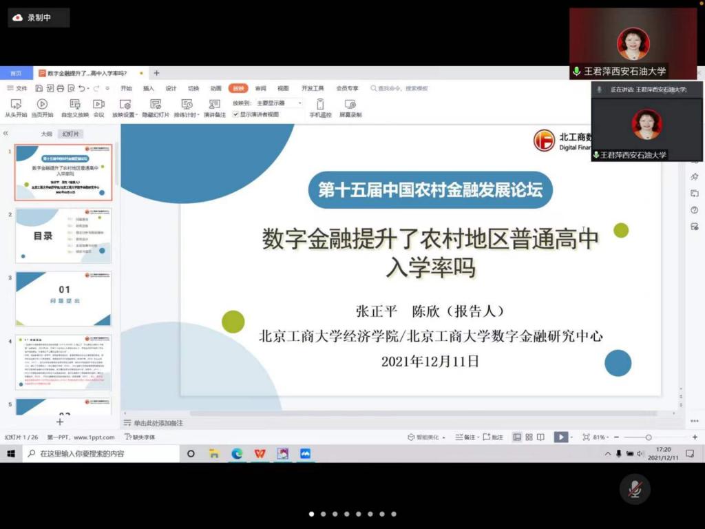12月11—12日,第十五届中国农村金融发展论坛在吉林财经大学和线上平台同步举行。经济管理学院院长王君萍教授应邀在“数字普惠金融理论与实践”分论坛作点评。学院教师刘莎,研究生刘亚倩、鲍晶婷、庞帅奇参加了本次论坛。