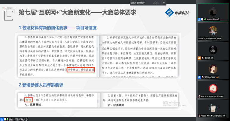 训练营第一讲由粤嵌科技有限公司全国运营项目项目经理蔡佳祥老师授课,蔡老师深入浅出,帮助学生了解什么是双创精神?并列举实例,分析“互联网+”创新创业大赛的发展趋势以及近几年大赛的新变化等内容,让学生切实感受到以赛促教、以赛促学、以赛促创的时代感和紧迫感。通过本节课,参训学员们对创新创业精神、创新创业竞赛有了深入理解,纷纷表示受益匪浅。