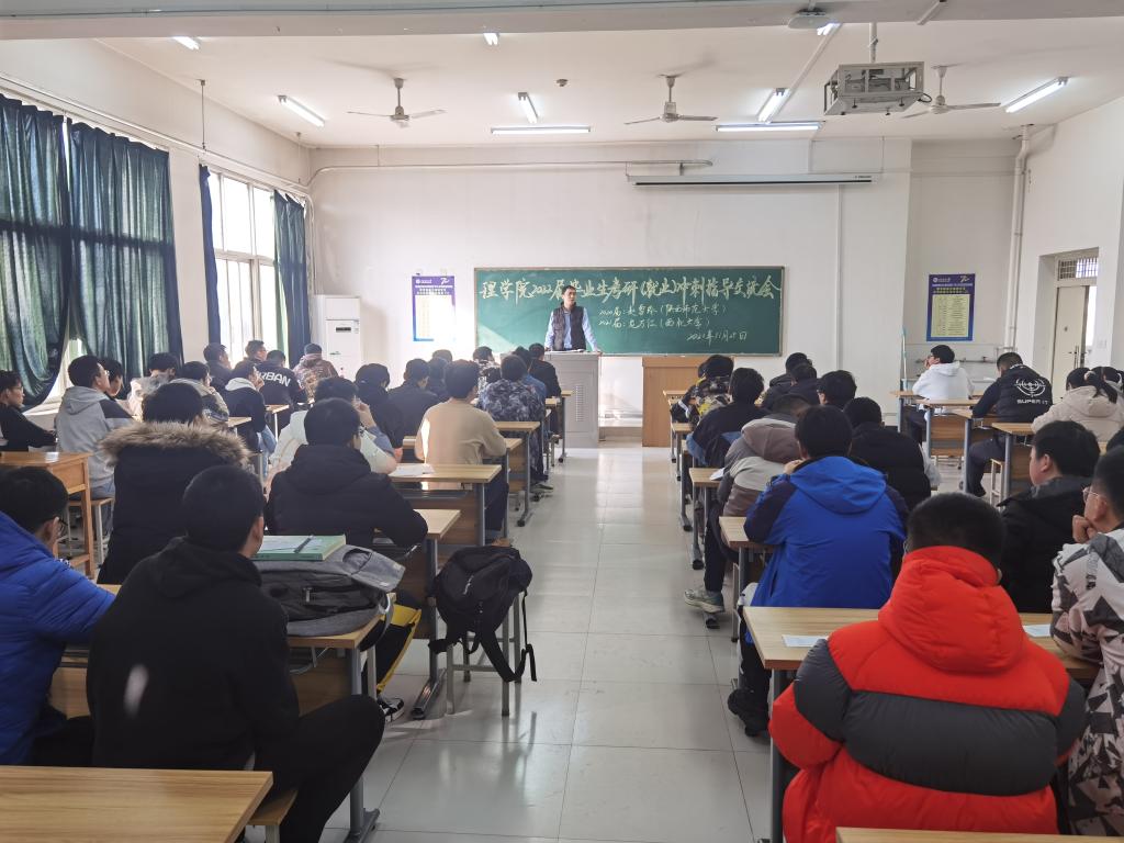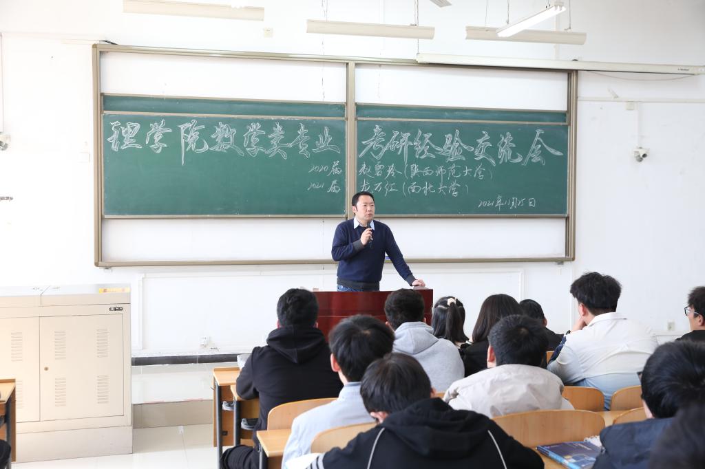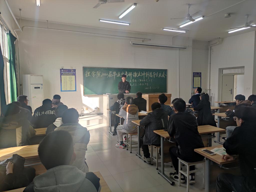 上午,学院先后在博览楼437教室、志远楼502教室组织了“理学院2022届毕业生考研(就业)冲刺指导交流会”,2018级全体本科生参加。在冲刺交流会上,赵雪玲校友就考研冲刺、考研前的心理状态调整、考研技巧、自己的考研心得等四个方面开展分享交流;龙万江校友不仅分享了自己去年考研的经验,还带来了其西北大学宿舍三位舍友对理学院考研学子的建议、寄语和忠告;何洋同学分享了自己两次考研的经历,在应试技巧方面给全体考研学子做了很好的交流。交流会上,学工办主任、2018级辅导员丁亦喆向全体同学通报各班目前的就业进展,分析就业考研中存在的问题,厘清下一步就业和考研工作的重点。学院党委副书记马小刚最后做了总结讲话,他深刻分析了近三年全国硕士研究生招生考试现状,理学院各专业的考研特点、难点,结合学生实际情况给大家提出四点意见和建议。