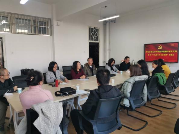 11月17日下午,外国语学院翻译系教工党支部在雁塔校区华油能源楼706会议室召开政治理论与业务学习扩大会。学院党委委员赵玮老师作为支部联系人参加会议,会议由党支部书记高鹏鹏主持。