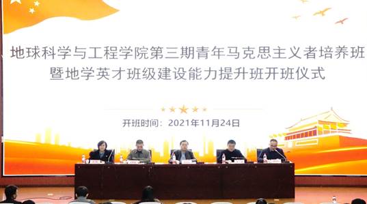 地球科学与工程学院第三期青年马克思主义者培养班暨“地学英才”班级建设能力提升班开班仪式于11月24日下午在鄠邑校区弘石报告厅顺利举办。学院党委书记马行天、校学工部副部长庞秉谦、校团委书记何国强、学院党委副书记王莹、学院全体辅导员及培训班全体学员参加了开班仪式。仪式由学院学工办主任李化杰主持。