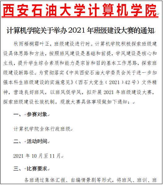 为贯彻落实《中共beat365官方网站委员会关于进一步加强本科生班级建设的实施意见》(西石大党生﹝2021﹞42号)文件精神,加强班级建设,进一步提升学生综合素质,10月25日,计算机学院在鄠邑校区A211教室举行班级建设大赛启动仪式。学院学生工作办公室主任乔晓,2021级辅导员姜楠、李路以及2021级学生代表参加。