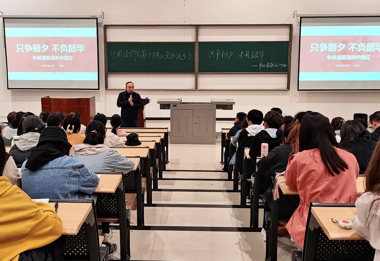 10月12日晚,外国语学院在鄠邑校区石工地科楼115教室举行第10期入党积极分子培训班第三次集中授课,校党委学生工作部副部长刘笛应邀担任主讲。共计200余名入党积极分子学员参加培训。