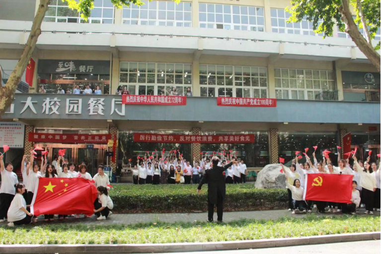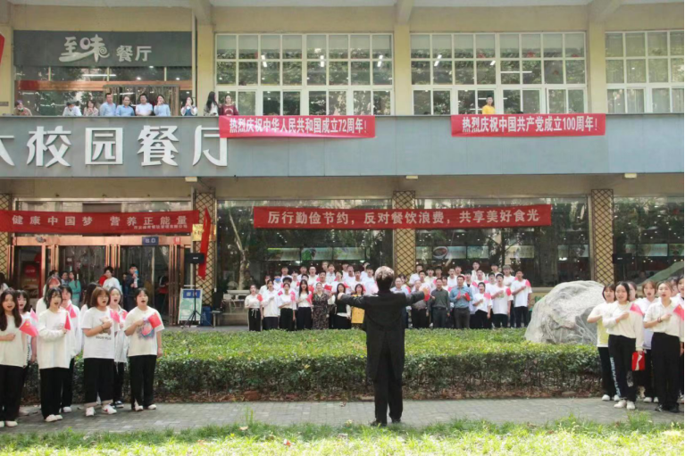 站在“两个一百年”奋斗目标的历史交汇点,为庆祝中华人民共和国72岁华诞和建党100周年,9月30日中午音乐系组织师生在雁塔校区学生餐厅举办“红歌快闪”活动,吸引了众多师生观看,场面热烈。副校长陈军斌,纪委、规划处、石油工程学院、经济管理学院、音乐系主要负责人,以及80余名音乐系师生参加了本次“红歌快闪”活动。该活动由音乐系党总支策划,何云、毛楠、朱玥三位老师指导。音乐系已连续四年五次举办“红歌快闪”活动,唱响主旋律,展现师生良好的精神风貌。