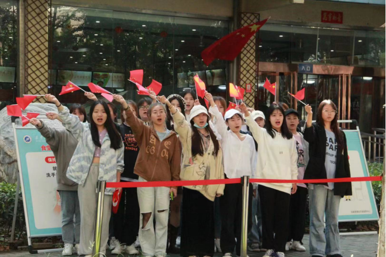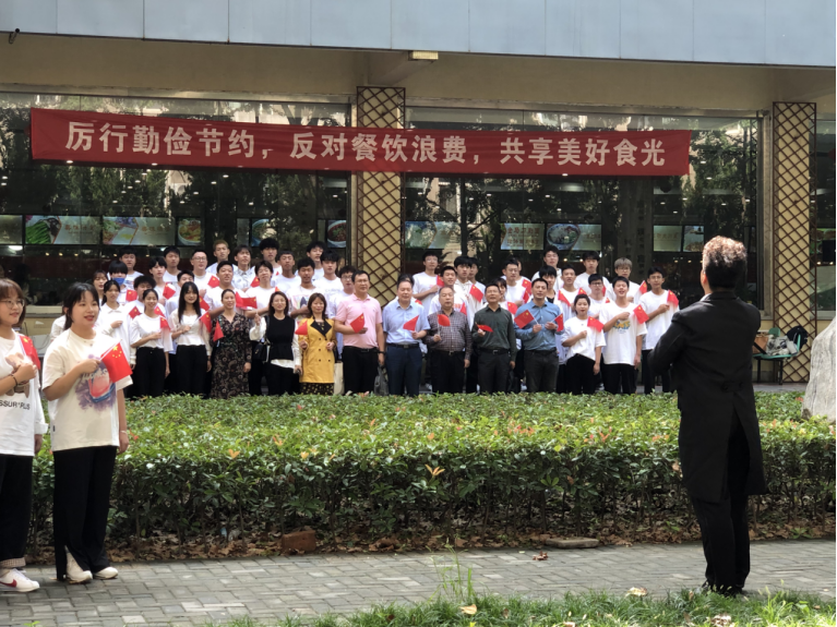 中午12点10分,“红歌快闪”活动正式开始,首先以小合唱和歌伴舞演绎了《我和我的祖国》。在优美的旋律中,手持红旗的师生们集体合唱了《红星闪闪》、《辉煌明天》两首歌曲,用歌声抒发心中爱国热忱。活动在师生们“我在beat365官方网站祝祖国生日快乐!”的欢呼声中圆满结束。