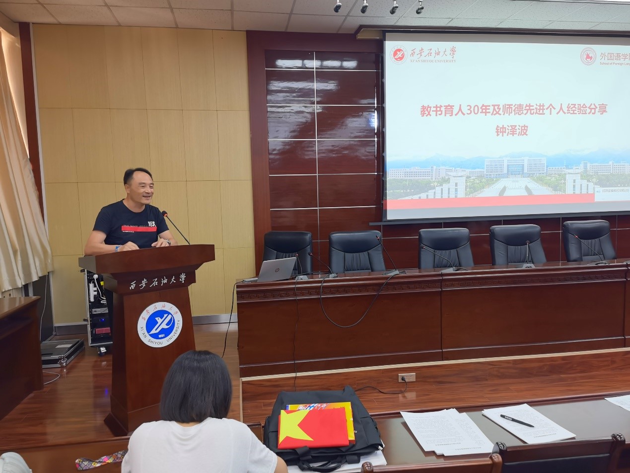 四、选树典型,强化榜样示范。学院积极选树典型,扎实开展师德师风评选工作,涌现出一批在教学岗位潜心育人的先进典型,俄语系、英语系获评校级师德先进集体。教师节期间,学院“教书育人30年”及“师德先进个人”钟泽波老师与全院教师分享30年从教的师者初心和育人使命,交流了“爱心、耐心、恒心、信心、操心”育人法,发挥了典型示范作用。